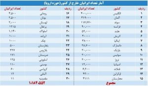 طبق این گزارش در قاره اروپا مقدونیه با ۱۱ ایرانی، کمترین تعداد ایرانیها را در مقایسه با ۳۰ کشور این قاره دارد. همچنین در میان ۲۹ کشور آسیایی که ایرانیها در آن اقامت دارند، کره شمالی با ۱ نفر، کمترین تعداد ایرانیهای مقیم خارج از کشور را در خود جای داده است. در بین ۳۲ کشور عربی و آفریقایی نیز که ایرانیها در آنها ساکن شدهاند، تنها یک نفر مقیم سیرآلئون است.