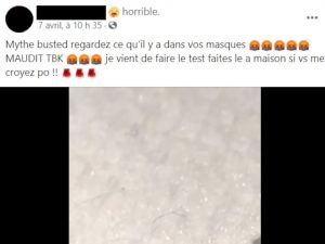 یک کاربر اینترنتی از کبک در ویدیویی در فیسبوک میگوید که روی ماسکهای توزیع شده در مدارس، موجودات یا کرمهای میکروسکوپی وجود دارند. این ویدیو بیش از 14هزار بار در فیسبوک به اشتراک گذاشته شده است.