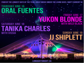 استعدادهای برتر موسیقی کانادا، چهار شب در زیر آسمان پرستاره سوئیفت کرنت و ساسکاچوان اجرا دارند. پنج شنبه ۱۶ ژوئن، گروه رگی Oral Fuentes جمعه ۱۷ ژوئن، یوکان بلوند با سینتهای چرخان و گروه راک، شنبه ۱۸ ژوئن تانیکا چارلز و یکشنبه ۱۹ ژوئن، اختتامیه جشنواره را با جیجی شیپلت همراه هستیم.