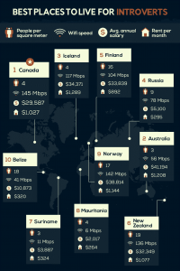 با تجزیه و تحلیل جمعیت در هر کیلومتر مربع، سرعت وای فای، اجاره و متوسط حقوق، مشخص شد که کانادا از سایر کشورها محیط مناسبتری برای افراد درونگرا است.